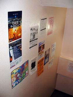 階段の壁に、今回折込に来てくださった劇団などのチラシを